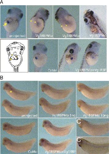 Fig. 5. Vg1RBP is required for pancreas formation. (A) Whole-mount in situ hybridization using antisense insulin probe in embryos, stage 43. Ventral views. Top panel, left to right: uninjected embryo, arrow indicates insulin expression in the pancreas; two embryos injected with 10 ng of Vg1RBPMo, arrowheads indicate defects in gut coiling and looping on the right side of the gut; dorsal view of an embryo injected with 10 ng of Vg1RBPMo shows no phenotypic abnormalities, suggesting that the effects of Vg1RBPMo are specific to the developing gut. Bottom panel, left to right: schematic representation of the gut of stage 43 embryo, arrowheads indicate the first loop of the small intestine posterior to the stomach; embryos injected with 10 ng Control Morpholino oligonucleotide (CoMo) ; coinjection of Vg1RBPMo with 0.5 ng Vg1RBP RNA rescues coiling of the anterior portion of the gut and expression of insulin in the pancreas. (B) Whole-mount in situ hybridization for insulin in embryos, stage 33. Top, left to right: uninjected embryos, arrowhead indicates insulin expression in the dorsal pancreatic bud; embryos injected with either 5 or 10 ng of Vg1RBPMo, as indicated. Bottom, left to right: embryos injected with 10 ng CoMo; coinjection of Vg1RBPMo with 0.5 ng Vg1RBP RNA rescues normal expression of insulin in the dorsal pancreatic rudiment. (C, C′) Higher magnification of one of the 10 ng Vg1RBPMo-injected embryos in (B). Clearing in Benzyl benzoate/Benzyl alcohol (C′) confirmed the absence of insulin-staining cells. |