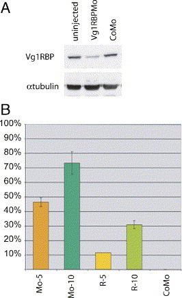Supplementary Fig. S4. Vg1RBP translation is specifically inhibited in vivo by Vg1RBPMo injection. (A) Uninjected embryos, injected embryos with either Vg1RBPMo, or CoMo into the vegetal pole were harvested at tadpole stage and processed for Western blot analysis of Vg1RBP and α-tubulin. Vg1RBP levels were reduced to 20% of original levels in the Vg1RBPMo-injected embryos compared to both uninjected and CoMo-injected embryos, as already described by (Yaniv et al., 2003). (B) Vg1RBPMo acts specifically. The percentage of embryos showing pancreatic phenotype (reduction of Pdx1 and insulin expression) following injection of 5 ng (Mo-5) and 10 ng (Mo-10) of Vg1RBPMo, and 10 ng of CoMo is illustrated. The phenotype is highly penetrant, with more than 70% of the antisense-injected embryos showing a pancreatic phenotype. Coinjection of 0.5 ng of sense Vg1RBP RNA with Vg1RBPMo (Vg1RBPMo 5 ng = R-5; Vg1RBPMo 10 ng = R-10) results in rescue of the mutant phenotype. Standard deviation was calculated from three independent experiments. |