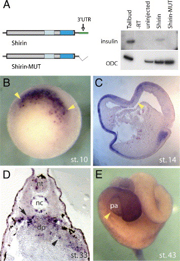Fig. 2. Shirin insulin-inducing activity is mapped to its 3â²UTR sequence. (A) On the left, schematic representation of Shirin full-length, showing the RhoGAP (light blue) and START (dark blue) domains. The last 400 nucleotides (nt) corresponding to the clone 904-4 D7 (referred to as Shirin 3â²UTR) are in green. On the right, animal caps injected with 60 pg of Shirin RNA and Shirin-MUT RNA, which lacks the 3â²UTR, at the two-cell stage and analyzed for the expression of insulin by RT-PCR at stage 32 (tailbud). (BâE) Shirin mRNA distribution during embryogenesis. (B) At gastrula stage, Shirin is detected at high level in dorsal vegetal cells by whole-mount in situ hybridization. Arrowheads indicate the dorsal lip. (C) Vibratome section of whole-mount in situ hybridization of embryo at neurula stage. Arrowhead indicates the expression of Shirin in the middle dorsal portion of the archenteron roof. (D) Shirin expression in a transverse section of a stage 33 tadpole. Arrow marks expression in dorsal mesodermal layer. Expression within endodermal cells is shown by a arrowhead. (E) At late tadpole stage, the expression of Shirin is confined to the pancreaticâduodenal region of Xenopus gut. Abbreviations: dp, dorsal pancreatic rudiment; nc, notochord; nt, neural tube; pa, pancreas. |