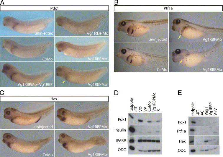 Fig. 6. Specific effect of Vg1RBP depletion on early pancreatic markers. (A) In situ hybridization for Pdx1 in embryos, stage 33. Left panel: uninjected and CoMo-injected embryo (injected with 10 ng CoMo) show expression of Pdx1 as a narrow band in the pancreatic/duodenum endoderm. Right panel, top to bottom: embryos injected with 10 ng of Vg1RBPMo. Coinjection of Vg1RBPMo with 0.5 ng Vg1RBP RNA rescues normal expression of Pdx1. Arrowhead indicates residual Pdx1 staining in the ventral pancreatic bud. (B) In situ hybridization for Ptf1a in embryos, stage 39/40. Left, top to bottom: uninjected embryo shows expression of Ptf1a in both dorsal (d) and ventral (v) pancreatic buds; embryos injected with 10 ng CoMo. Right panel: embryos injected with 10 ng of Vg1RBPMo. Arrows indicate residual Ptf1a staining in the ventral pancreatic bud. (C) In situ hybridization for Hex in embryos, stage 37. Left, top to bottom: uninjected embryo shows expression in the endoderm of the liver diverticulum; embryos injected with 10 ng CoMo. Right panel: embryos injected with 10 ng of Vg1RBPMo. (D) Dorsal vegetal blastomeres injected with 10 ng CoMo, 10 ng Vg1RBPMo, and 10 ng Vg1RBPMo + 0.5 ng Vg1RBP RNA (indicated as R. for rescue) were dissected at early gastrula stage. Uninjected dorsal vegetal (VD) and ventral vegetal (VV) pole halves were used as control, for their regional differences in the expression of endodermal markers (expression of Pdx1 and insulin is confined to VD; IFABP is expressed in both VV and VD) (Henry et al., 1996). All samples were collected at stage 34 (tadpole) and assayed by RT-PCR analysis for markers of pancreatic specification (Pdx1 and insulin) and intermediate-posterior endoderm (IFABP). (E) Animal caps injected with 60 pg VegT RNA and/or 0.5 ng Vg1RBP RNA, as indicated. Coinjection of VegT + Vg1RBP is indicated as V + V. The explants were cultured until stage 34 (tadpole) and analyzed for expression of late endodermal markers by RT-PCR. |
