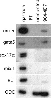 Supplementary Fig. S1. The clone 904-4 D7 specifically induces the expression of endodermal markers in the absence of mesodermal cells. RT-PCR analysis of animal caps injected with 1 ng 904-4 D7 RNA and cultured until stage 11 (gastrula). Induction of specific endodermal markers was observed, such as mixer and Gata5 (Weber et al., 2000), but not the general endodermal factor, Sox17alpha (Henry et al., 1996). Importantly, we observed no induction of the endo/mesodermal marker mix.1 and very weak induction of the pan-mesodermal marker, brachyury (BU) (Henry and Melton, 1998). ODC was used as a loading control for RT-PCR. |