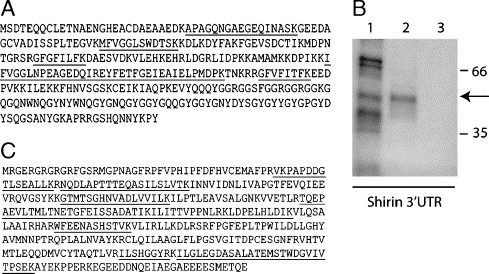 Supplementary Fig. S2. Identification of trans-acting factors that bind to the Shirin 3â²UTR by RNA affinity chromatography and mass spectrometry. (A) Amino acid sequence of hnRNPA/B and of the different peptides determined by mass spectrometry from purified p50 (underlined). The 9 peptides, some of which overlapped, all mapped to Xenopus A/B-type hnRNP. (B) To confirm that the p50 purified protein is hnRNPA/B, we immunoprecipitated the complex p50 UV cross-linked to Shirin 3â²UTR probe. 32P-labeled Shirin 3â²UTR was incubated with tadpole protein extracts, UV cross-linked to bound proteins and immunoprecipitated using an antiserum directed against hnRNPA/B (kind gift of S. Pinol-Roma) (lane 2) or preimmune serum as negative control (lane 3). Only the hnRNPA/B antiserum immunoprecipitated specifically the Shirin 3â²UTR/protein complex following UV cross-linking experiment (lane 2). Lane 1 shows the polypeptide complex UV cross-linked before immunoprecipitation. This result is in agreement with the fact that ARE motifs binding sites for hnRNPA/B (C) Amino acid sequence of Ilf-2/NFAT and of the different peptides identified by mass spectrometry from purified p46 (underlined). The 16 peptides, some of which overlapped, all matched to and covered about 30% of Xenopus Ilf2/NFAT sequence. |