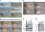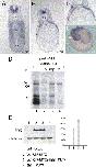 Supplementary Fig. S3. In situ hybridization for Vg1RBP expression in tailbudâtadpole stages embryos. (AâBâ²) In situ hybridization for Vg1RBP on progressive anterior to posterior sections of tailbudâtadpole stages embryos. (A) Transverse section of stage 32 embryo. (BâBâ²) Transverse section of stage 34 embryo. Arrow in (B) indicates Vg1RBP transcript in the dorsal mesodermal layer. (Bâ²) Detail of panel B. Open arrowheads indicate Vg1RBP transcript in the dorsal mesodermal layer. Abundant expression of Vg1RBP is detected in the neural tube, as previously described (Yaniv et al., 2003). (C) Whole-mount in situ hybridization for Vg1RBP on stage 44 Xenopus gut. Abbreviations: dp, dorsal pancreatic rudiment; gd, gastroduodenal cavity; hp, hepatic cavity; nc, notochord; nt, neural tube; pa, pancreas. (D) UV cross-linking assay using 32P-VLE RNA as probe and Xenopus embryo extracts. In the absence of competitor RNA (lane 1). Competitions were carried out with 100-fold excess of specific competitor (sp, unlabeled VLE; lane 2), non-specific competitor (nsp, polylinker of MT-pCS2+; lane 3), 10 μM AS1 (lane 4). Arrow indicates the 69-kDa Vg1RBP cross-linked protein complex (Deshler et al., 1998, Havin et al., 1998). (E) Shirin 3â²UTR influences Vg1RBP protein levels. Uninjected embryos (lane 1); embryos injected with either myc-tagged Vg1RBP RNA (lane 2), myc-tagged Vg1RBP RNA together with Shirin 3â²UTR RNA (lane 3), or Shirin 3â²UTR RNA alone (lane 4) into the vegetal pole. Embryos were harvested at tadpole stage and processed for Western blot analysis of myc-tagged Vg1RBP and α-tubulin. On the right, histogram presents the quantification by densitometry of the Western blot. Protein level of myc-tagged Vg1RBP is set to 100% (lane 2), relative increase of 40% is observed in the presence of Shirin 3â²UTR (lane 3). The values were normalized to α-tubulin. The average of three experiments shows a relative increase of 35% (data not shown). |