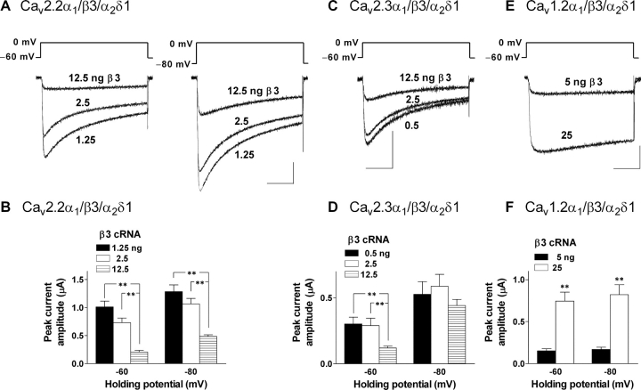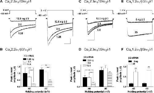 Figure 1. . The β3 subunit markedly suppressed the current amplitude of N-type (Cav2.2; A and B) and R-type (Cav2.3; C and D), but not L-type (Cav1.2; E and F) calcium channels at physiological HPs in Xenopus oocytes. For N- and R-type channels, cells were injected with cRNAs (cDNA for Cav2.3α1) encoding either Cav2.2α1 (2.5 ng/cell) or Cav2.3α1 (4.5 ng/cell) and α2δ1 (2.5 ng/cell) in combination with β3 (1.25, 2.5, or 12.5 ng/cell). Cells expressed L-type channels were injected with cRNA encoding Cav1.2α1 (5 ng/cell) and α2δ1 (12.5 ng/cell) in combination with β3 (5 or 25 ng /cell). Currents were evoked by a brief depolarization to 0 mV from HPs of â60 and â80 mV. (A, C, and E) Superimposed current traces of whole cell Ba2+ currents through the calcium channels. Bars, 0.5 μA and 50 ms. Residual capacitance transients after leak subtraction have been erased. (B, D, and F) Summary of the effects of the β3 subunit on the peak currents of N- (n = 9), R- (n = 7), and L-type (n = 4) calcium channels. Data are indicated as mean ± SE. Asterisks denote significant difference between any two groups in each set of experiments (**P < 0.01; one-way ANOVA with Bonferroni's multiple comparison test for B and D and unpaired t-test for F). |