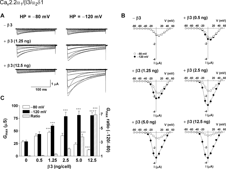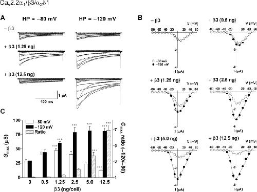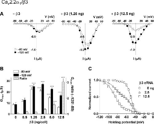Figure 2. . The β3 subunit caused a biphasic effect on N-type calcium channels at a physiological HP. Oocytes were injected with cRNAs encoding Cav2.2α1 (2.5 ng/cell) and α2δ1 (2.5 ng/cell) in combination with various concentrations of β3 (0, 0.5, 1.25, 2.5, 5, or 12.5 ng/cell). (A) Examples of whole cell Ba2+ currents at HPs of â80 mV (left) and â120 mV (right). (B) Corresponding I-V relationships for peak Ba2+ currents at HPs of â80 (open circle) and â120 mV (closed circle). Activation midpoints (V1/2, act at the HPs of â80 and â120 mV) calculated from the Boltzmann fitting are: β3 0 ng, â2.7 and â3.0 mV; 0.5 ng, â3.4 and â5.8 mV; 1.25 ng, â4.1 and â8.5 mV; 2.5 ng, â5.9 and â12.4 mV; 5.0 ng, â6.8 and â13.3 mV; 12.5 ng, â10.7 and â14.7 mV, respectively. (C) Effects of the β3 subunit on the maximum conductance (Gmax) at the HPs of â80 (open column) and â120 mV (closed column) and the Gmax ratio (hatched column). Data are indicated as mean ± SE (n = 11â12 from two frogs). Asterisks denote significant difference versus the control group without β3 (***P < 0.001; one-way ANOVA with Dunnett's multiple comparison test). |
