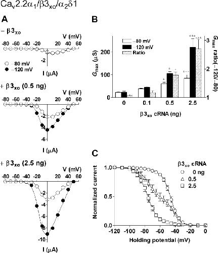 Figure 4. . The oocyte β3 (β3xo) subunit injected exogenously with N-type calcium channels modified channel properties similar to that observed for the rat β3 subunit. Oocytes were injected with cRNAs encoding Cav2.2α1 (2.5 ng/cell) and α2δ (2.5 ng/cell) subunits in combination with various concentrations of β3xo subunit (0, 0.1, 0.5, or 2.5 ng/cell). (A) I-V relationships for peak Ba2+ currents at HPs of â80 (open circle) and â120 mV (closed circle). (B) Effects of the β3xo subunit on the maximum conductance (Gmax) at HPs of â80 mV (open column) and â120 mV (closed column) and Gmax ratio (hatched column). (C) The β3xo caused a leftward shift of the steady-state inactivation curve. Inactivation midpoints (V1/2, inact) were as follows: β3xo 0 ng (LVI and HVI), â72.6 and â45.5 mV; 0.5 ng, â74.7 and â42.1 mV; 2.5 ng, â75.4 and â40.0 mV. Proportions of LVI were as follows: β3xo 0 ng, 7.6%; 0.5 ng, 55.7%; 2.5 ng, 96.0%. Data are indicated as mean ± SE (A and B, n = 5 from 1 frog; C, n = 5â6 from 2â3 frogs). Asterisks denote significant difference versus the control group without β3 (*P < 0.05, ***P < 0.001). |
