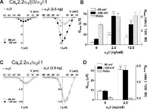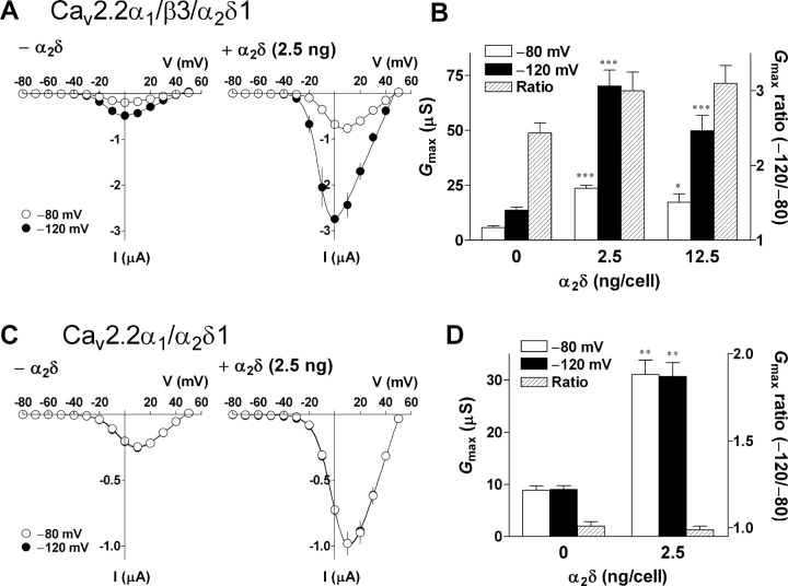 Figure 6. . The α2δ subunit markedly enhanced Gmax of the N-type calcium channels but had little or no effect on Gmax ratio. Oocytes were injected with cRNAs encoding Cav2.2α1 (2.5 ng/cell) in combination with α2δ (0, 2.5, or 12.5 ng/cell) in the presence (A and B) or absence (C and D) of the β3 subunit (2.5 ng/cell). (A and C) I-V relationships for the peak Ba2+ currents at HPs of â80 mV (open circle) and â120 mV (closed circle). (B and D) Effects of the α2δ subunit on Gmax at HPs of â80 (open column) and â120 mV (closed column) and Gmax ratio (hatched column). Data are indicated as mean ± SE (A and B, n = 5â6; C and D, n = 6 from 1 frog each). Asterisks denote significant difference versus the control group without β3 (*P < 0.05, **P < 0.01, ***P < 0.001). |
