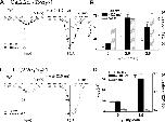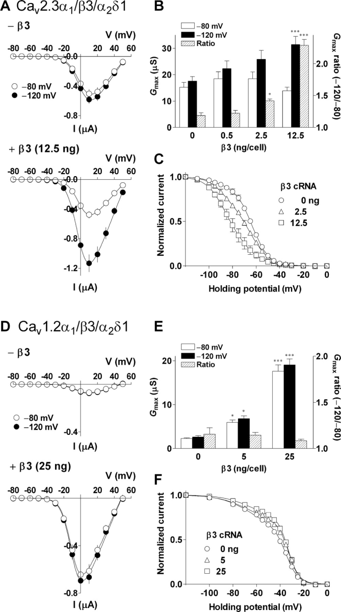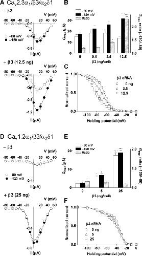 Figure 7. . Effects of the β3 subunit on R- (AâC) and L- (DâF) type calcium channels. For R-type channels, oocytes were injected with cRNA (cDNA for α1) encoding Cav2.3α1 (4.5 ng/cell) and α2δ (2.5 ng/cell) in combination with various concentrations of β3 (0, 0.5, 2.5 or 12.5 ng/cell). Cells expressing L-type channels were injected with cRNA encoding Cav1.2α1 (5 ng/cell), α2δ (12.5 ng/cell), and β3 (0, 5, or 25 ng/cell). (A and D) I-V relationships for the peak Ba2+ currents at HPs of â80 mV (open circle) and â120 mV (closed circle). (B and E) Effects of the β3 subunit on Gmax at different HPs. Gmax ratio (hatched column) was calculated from Gmax at â80 (open column) and â120 mV (closed column). (C and F) Effect of the β3 subunit on steady-state inactivation. Inactivation midpoints (V1/2, inact) were as follows: R-type/β3 0 ng (LVI and HVI), â94.7 and â63.3 mV; 2.5 ng, â89.5 and â64.7 mV; 12.5 ng, â86.5 and â58.5 mV; L-type/β3 0 ng (LVI and HVI), â65.3 and â35.0 mV; 5 ng, â67.1 and â32.8 mV; 25 ng, â64.2 and â33.0 mV. Proportion of LVI was as follows: R-type/β3 0 ng, 10.6%; 2.5 ng, 28.3%; 12.5 ng, 90.8%; L-type/β3 0 ng, 38.8%; 5 ng, 31.9%; 25 ng, 28.7%. Data are indicated as mean ± SE (A and B, n = 8 from 2 frogs; C, n = 4â7 from 2 frogs; D and E, n = 5 from 1 frog; F, n = 4 from 1 frog). Asterisks denote significant difference versus the control group without β3 (*P < 0.05, ***P < 0.001). |