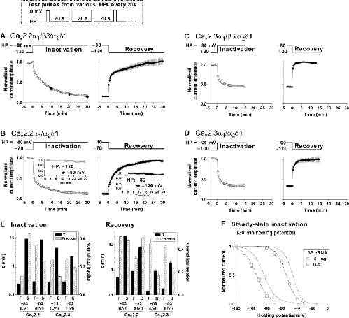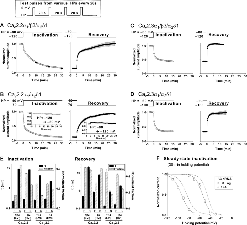 Figure 8. . Slow kinetics of the closed-state inactivation of N- and R-type calcium channels. Oocytes were injected with cRNAs (cDNA for Cav2.3α1) encoding either Cav2.2α1 (2.5 ng/cell) or Cav2.3α1 (4.5 ng/cell) and α2δ (2.5 ng/cell) in the absence or presence of β3 (12.5 ng/cell). The kinetics of the inactivation and the recovery from the inactivation were investigated by altering HPs as indicated in each panel (AâD). Kinetic curves were derived from peak currents elicited by repetitive test pulses (100 ms) to 0 mV every 20 s as shown in the top. (A and B) Inactivation kinetics of N-type calcium channels. Cav2.2α1 with (A) or without β3 (B) corresponds to LVI or HVI of the steady-state inactivation curve of N-type channels, respectively (see Fig. 3 A). Closed diamonds in A are inactivation kinetics when channel activity was tested every 10 min instead of at 20-s intervals (n = 4). Inserts in B are control experiments indicating stable channel activity during a whole experiment (n = 8). (C and D) Inactivation kinetics of R-type calcium channels. Cav2.3α1 with (C) or without β3 (D) corresponds to LVI or HVI of the steady-state inactivation curve of R-type channels, respectively (see Fig. 7 C). All the inactivation and recovery kinetic curves were fitted statistically better to a two-phase exponential than to a mono exponential function (F-test). (E) Time constants (Ï) and corresponding fractions for the kinetics of inactivation and recovery from the inactivation. F and S indicate a fast and a slow component, respectively. Data are indicated as mean ± SE (n = 4â6 from 2 frogs). (F) Steady-state inactivation with 30-min HPs. Broken lines show inactivation curves obtained with 3-min HPs for comparison (see Fig. 3 A). Each data point was obtained from individual oocytes and represents mean ± SE (n = 4â5 from 2â3 frogs). |