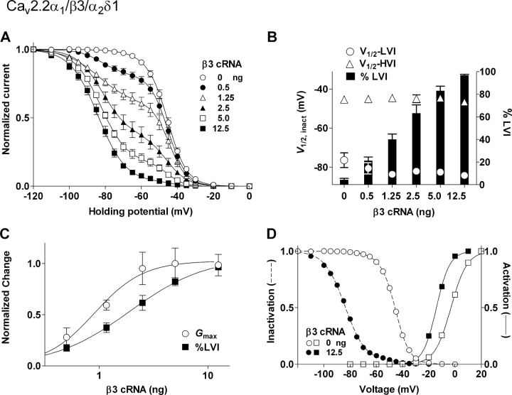 Figure 3. . The β3-induced hyperpolarizing shift of the steady-state inactivation curves of N-type calcium channels is attributed to change in the proportion of two components of the curves. Oocytes were injected with cRNAs as shown in Fig. 2. (A) Steady-state inactivation for HPs of 3-min duration. Data are indicated as mean ± SE (n = 7â15 from 3â7 frogs for each group). Note that HPs of 3 min did not induce maximal inactivation and therefore reflect âpseudo-steady-stateâ inactivation (compare Fig. 8). (B) Effects of the β3 subunit on inactivation midpoints (V1/2, inact) of LVI (open circle) and HVI (open triangle) and the proportion of LVI (%LVI; closed column). Plotted data were derived from the curve fitting in panel A and shown as mean ± SE. (C) Difference in concentration dependency of the β3-induced enhancement of Gmax and increase in the %LVI. Plotted data were derived from B and Fig. 2 C for %LVI and Gmax at a HP of â120 mV, respectively. Data were normalized by dividing each value by the maximum value and are expressed as mean ± SE. (D) No or little overlap of activation and inactivation curves seen in the presence or absence of β3. Plotted data were derived from panel A and Fig. 2 B. |