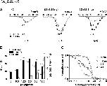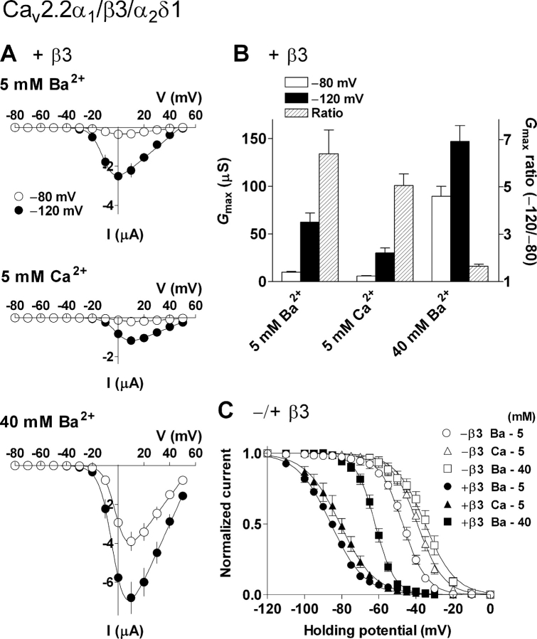 Figure 9. . Effects of different charge carriers (divalent cations) on the β3 subunit-induced inactivation of N-type calcium channels. Oocytes were injected with cRNAs encoding Cav2.2α1 (2.5 ng/cell), α2δ (2.5 ng/cell) and β3 (12.5 ng/cell). Recording was performed with a bath solution containing 5 or 40 mM Ba2+, or 5 mM Ca2+ as the charge carrier. (A) I-V relationships for the peak divalent cation currents at HPs of â80 (open circle) and â120 mV (closed circle). (B) Effects of the different charge carriers on Gmax at HPs of â80 (open column) and â120 mV (closed column) and Gmax ratio (hatched column). (C) Effects of the different charge carriers on steady-state inactivation. For simple comparison, inactivation midpoints (V1/2, inact) obtained with and without β3 were derived from a single Boltzmann equation: 5 mM Ba2+ (âβ3 and +β3), â47.3 and â85.4 mV; 5 mM Ca2+, â39.1 and â81.0 mV; 40 mM Ba2+, â35.5 and â62.0 mV. Data are indicated as mean ± SE (A and B, n = 7 from 2 frogs; C, n = 5â6 from 2â4 frogs). |
