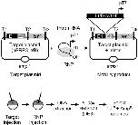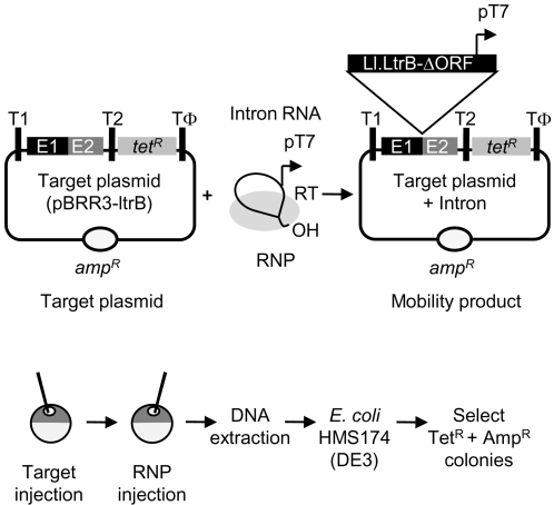 Figure 3. Assay of group II intron-RNP stimulated homologous recombination in X. laevis oocyte nuclei.A target plasmid (pBRR3-ltrB) containing the Ll.LtrB intron-insertion site (IS; ligated ltrB exon 1 and 2 sequences; E1 and E2) was co-injected into X. laevis oocyte nuclei with a 5.4-kb linear donor DNA, consisting of a 4-kb phage λ sequence with an inserted T7 promoter, flanked by 705- and 718-bp sequences homologous to those flanking the Ll.LtrB-insertion site in the target plasmid. Ll.LtrB RNPs containing the 0.9-kb Ll.LtrB-ΔORF intron and the group II intron RT were then injected into the same oocyte nuclei. A double-strand break resulting from intron RNA reverse splicing and second-strand cleavage at the Ll.LtrB target site stimulates homologous recombination, resulting in the insertion of the donor DNA containing the T7 promoter, thereby activating the tetR gene. Nucleic acids were isolated and electroporated into E. coli HMS174(DE3), and the targeting efficiency was calculated as the ratio of (TetR+AmpR)/AmpR colonies.