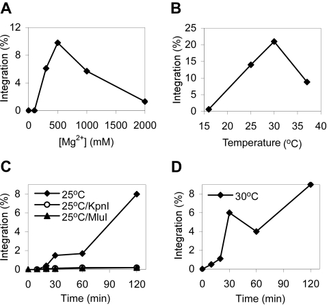 Figure 2. Determination of optimal conditions for site-specific integration of group II intron RNPs into a plasmid target site in X. laevis oocyte nuclei.(A) Mg2+-concentration dependence. Target plasmid DNA (10 ng) with 0 to 2,000 mM MgCl2 and 17 mM dNTPs was injected into X. laevis oocyte nuclei followed by Ll.LtrB lariat RNPs (50 ng). The oocytes were incubated for 2 h at 25°C. (B) Temperature dependence. Target plasmid DNA (9 ng) with 500 mM MgCl2 and 17 mM dNTPs was injected into X. laevis oocyte nuclei followed by Ll.LtrB lariat RNPs (50 ng). The oocytes were incubated for 2 h at different temperatures. (C and D) Time courses at 25°C or 30°C, respectively. Target plasmid DNA (4.5 ng) with 500 mM MgCl2 and 17 mM dNTPs was injected into X. laevis oocyte nuclei, followed by Ll.LtrB lariat RNPs (36 ng). The oocytes were incubated for the indicated times and then quick frozen on dry ice. Nucleic acids isolated from the 25°C-incubated oocytes were untreated or digested with KpnI or MluI (10 units; New England Biolabs) for 1 h at 37°C and then extracted twice with phenol-CIA and ethanol precipitated prior to electroporation into E. coli. In (A)–(D), injection volumes were 18 nl. Integration efficiencies (%) were determined by electroporating nucleic acids extracted from oocytes into E. coli HMS174(DE3), followed by plating to determine ratios of (TetR+AmpR)/AmpR colonies, as described in Figure 1 and Materials and Methods. Each experiment was repeated at least once with essentially the same results.