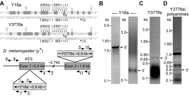 Figure 5. Site-specific integration of retargeted Ll.LtrB introns into chromosomal target sites in the Drosophila melanogaster yellow (y) gene.(A) DNA target site sequences and Ll.LtrB intron RNA base-pairing interactions for targetrons Y18a and Y3776s. Retargeted Ll.LtrB-ΔORF introns (targetrons) are denoted by a number that corresponds to the nucleotide position 5′ to the Ll.LtrB intron-insertion site numbered from the A of the ATG initiation codon, followed by “a” or “s”, indicating sense and antisense strand respectively. The DNA target sequences are shown from positions −30 to +15 from the intron-insertion site, with nucleotide residues that match those in the wild-type Ll.ltrB intron target sequence [7] highlighted in gray in the top strand. The intron-insertion site (IS) in the top strand and the IEP-cleavage site (CS) in the bottom strand are indicated by arrowheads. Below is shown a schematic of the Drosophila yellow (y) gene (NCBI accession number P09957), with the targetron-insertion sites indicated, and a diagram of the PCRs used to detect site-specific targetron insertion. y gene exons are gray rectangles, and introns and flanking sequences are lines. PCR primers used to detect and sequence the targetron integrations are indicated by numbered arrows. (B) PCR analysis of targetron Y18a integration using a double-injection protocol. Fifty embryos were injected with a solution containing 100 mM MgCl2+17 mM dNTPs followed by Y18a lariat RNPs (0.9 mg/ml). The embryos were incubated for 1 h at 30°C followed by 48 h at 18°C. Nucleic acids were isolated, and PCR products corresponding to the 5′- and 3′-junctions of Y18a integrated at its chromosomal target site (1,156-bp and 238-bp, respectively) were detected by nested PCR using the following primer pairs: 5′-junction, primers 1 (LtrB+940a) and 2 (yellow+277a), followed by primers 3 (LtrB+933a) and 4 (yellow+241a); 3′-junction, primers 5 (LtrB+788s) and 6 (yellow-350a), followed by primers 7 (LtrB+880s) and 8 (yellow-160s) (see Materials and Methods). (C) PCR analysis of targetron Y3776s integration using a double-injection protocol. Forty embryos were injected with 100 mM MgCl2 followed by Y3776s lariat RNPs (1.3 mg/ml), and the embryos were then incubated for 30 min at 37°C. Nucleic acids were isolated, and a 702-bp PCR product corresponding to the 3′-junction of Y3776s integrated at its target site was detected by PCR using primers 5 (LtrB+788s) and 9 (yellow+4325a) (see Materials and Methods). The dark band at the bottom of the gel is RNA. (D) PCR analysis of Y3776s integration using a single-injection protocol. Thirty embryos were injected with a solution containing100 mM KCl, 5 mM putrescine dihydrochloride, 3 mM spermidine trihydrochloride, 1 mM spermine tetrahydrochoride, 5 mM MgCl2, and Y3776s linear RNPs (0.5 mg/ml). After incubating the embryos for 30 min at 37°C, nucleic acids were isolated as described above, and a 348-bp PCR product (arrow) corresponding to the 3′-junction for Y3776s integrated at its target site was detected by nested PCR using primers 5 (LtrB+788s) and 9 (yellow+4325a), followed by primers 10 (LtrB+870s) and 11 (yellow+4054a) (see Materials and Methods). Other bands in the gel are likely due to non-specific annealing of the primers. In (B–D), the PCR products were analyzed by electrophoresis in a 1% agarose gel, which was stained with ethidium bromide, and the identities of the PCR products were confirmed by sequencing across the integration junctions (not shown).