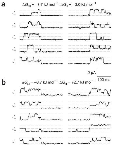 Figure 2. Slow-gate closures recorded from patches with identical chloride gradients and different proton gradients. For each patch, the first five asymmetrical slow-gate closures are shown. For both patches, the chloride concentration was 120 mM (symmetrical) and the membrane voltage was held at −90 mV. In a, a one-pH-unit gradient (pHint 7.5, pHext 8.5) was imposed; in b, a two-pH-unit gradient (pHint 7.0, pHext 9.0) was imposed. The corresponding energies for the chloride and proton electrochemical gradients (ΔGCl and ΔGH) are noted.