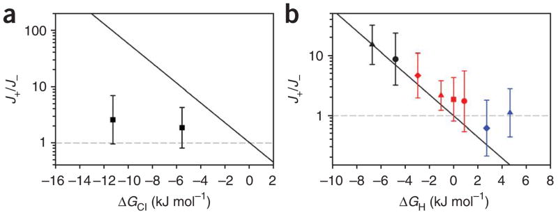 Figure 3. The gating asymmetry ratio J+/J− as a function of free energy released from chloride transport, ΔGCl, and proton transport, ΔGH. The black solid lines show the maximal expected gating asymmetry for the case in which the gating is powered by chloride transport (a) or proton transport (b). Error bars represent the 95% confidence intervals. In b, the different colors code for different values of pHext (black, 7.5; red, 8.5; blue, 9.5) and the different symbols represents different voltages (circles, −50 mV; squares, −58 mV; triangles, −70 mV; diamonds −90 mV). Thus, the data points represented by the same symbols (but different colors) have the same electrochemical gradients for chloride ions (but different electrochemical gradients for protons).