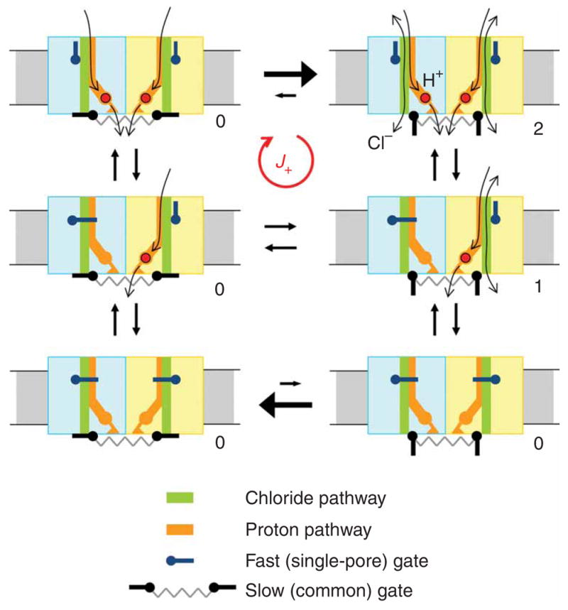 Figure 4. A possible model for non-equilibrium gating in ClC-0. The diagrams represent ClC-0 dimers with chloride pathways (green) and proton pathways (orange). Both pathways are controlled by the fast gate (dark blue) at the extracellular side. Only the chloride pathway is gated by the slow gate (black) at the intracellular side. The slow gates within individual subunits of the dimer are coupled (gray ‘spring’), such that these gates always open and close simultaneously. The number in the corner of each diagram indicates the number of open chloride pores (that is, the conductance level). The red spheres represent protons binding inside the translocation pathway. The proton electrochemical gradient is inward (movement of protons from outside to inside is energetically downhill) and hence J+/J− > 1. In this framework, the simple assumption that binding of protons to the intracellular site favors slow-gate opening results in cycling in the J+ direction. Experimentally, this is observed as channels more often entering the inactivated state (left-hand column) from the one-pore open state and returning from inactivation to the two-pore open state. (Note: transitions to the inactivated state directly from the level-1 state (right, middle) cannot be distinguished experimentally from those that occur from the level-0 state (right, below).) The slow gate opens more frequently when the fast gates are open because the protons can enter and bind to the activation site; the slow gate closes more frequently when the fast gates are closed because the protons escape down their electrochemical gradient.