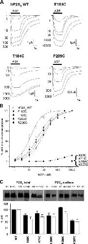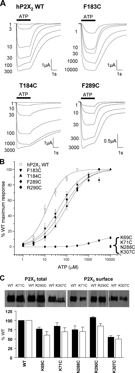 FIGURE 2. Effect of point cysteine P2X2 mutations on ATP potency. ATP potency was tested on WT and P2X2 receptor mutants expressed in oocytes by two-electrode voltage clamp (holding potential =–60 mV). A, trace data representative of currents observed for wild type and mutant receptors in response to ATP applications (indicated by the bar, concentrations in micromolar) at 5-min intervals. B, concentration-response curves to ATP for WT and mutants K69C, K71C, F183C, T184C, N288C, F289C, R290C, and K307C. K69C, K71C, N288C, and K307C with reduced peak currents in response to a maximal concentration of ATP, are expressed as a percentage of the amplitude of the WT maximum response, whereas all others are expressed as a percentage of their own maximum response (n = 3–10). C, Western blots of total and surface expression levels of WT and mutant P2X2 receptors with reduced peak current amplitudes. Lower panel shows densitometric analysis of the blots expressed as % of WT levels. |