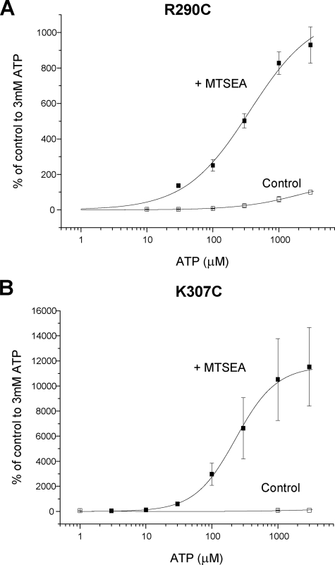 FIGURE 4. Effect of MTS compounds on ATP potency at P2X2 cysteine mutants. A, ATP concentration-response curve for R290C under control conditions or following washout of MTSEA after a 10-min incubation with MTSEA (1 mm)(n = 3–4). B, ATP concentration-response curve for K307C under control conditions or following washout of MTSEA after a 10-min incubation with MTSEA (1 mm)(n = 3–6). The data are expressed as a percentage of the amplitude of the response to 3 mm ATP under control conditions. |