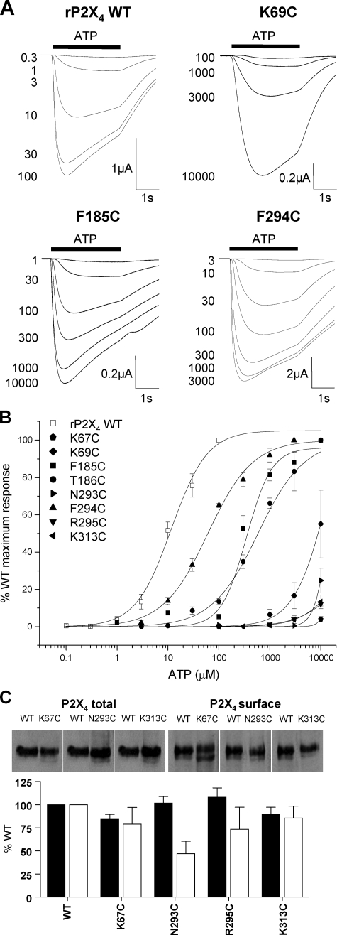 FIGURE 5. Effect of point cysteine P2X4 mutations on ATP potency. ATP potency was tested on WT and P2X4 receptor mutants expressed in oocytes by two-electrode voltage clamp (holding potential = –60 mV). A, trace data representative of currents observed for wild type and mutant receptors in response to ATP applications (indicated by bar, concentration in micromolar) at 5-min intervals. B, concentration-response curves to ATP for WT and mutants K67C, K69C, F185C, T186C, N293C, F294C, R295C, and K313C. K67C, K69C, N293C, R295C, and K313C, with reduced peak currents in response to a maximal concentration of ATP, are all expressed as a percentage of peak WT maximum response whereas, all others are expressed as a percentage of their own maximum response (n = 3–4). C, Western blots of total and surface expression levels of WT and mutant P2X4 receptors with reduced peak current amplitudes. Lower panel shows densitometric analysis of the blots expressed as % of WT levels. |