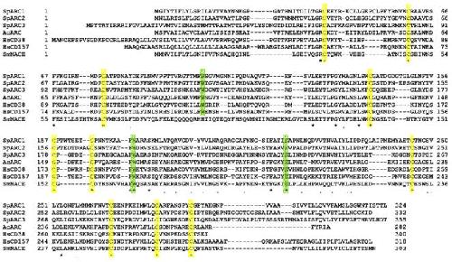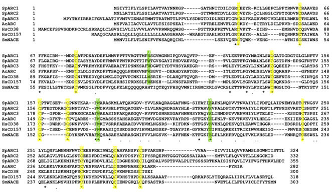 Figure 1. A new family of sea urchin ADP-ribosyl cyclases.A, Sequence alignment of the predicted coding regions of three ADP-ribosyl cyclases isolated from Stronglycentrotus purpuratus cDNA libraries (termed SpARC1-3) and representative members of the ADP-ribosyl cyclase family. Conserved cysteine and catalytic residues are highlighted in yellow and green, respectively. Abbreviations: Ac, Aplysia californica; Hs, Homo sapiens; Sm, Schistosoma mansoni. |