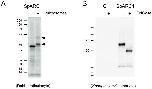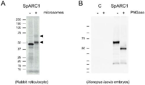 Figure 2. SpARC1 is glycosylated.A, In vitro translation. mRNA coding for C terminally myc-tagged SpARC1 was translated in the presence of [35S]methionine using rabbit reticulocyte lysate. Autoradiogram of translation reactions performed in the absence (−) or presence (+) of canine pancreatic microsomes. B, Expression of SpARC1 in Xenopus laevis embryos. Western blot analysis using an anti-myc antibody of homogenates prepared from control embryos (C) or embryos injected with mRNA for myc-tagged SpARC1. Samples were either mock treated (−) or digested with PNGase F (+) prior to analysis (left). Migration of molecular mass markers (in kDa) is shown on the left of the panels. |