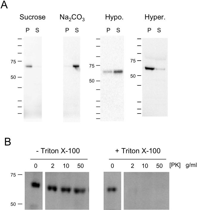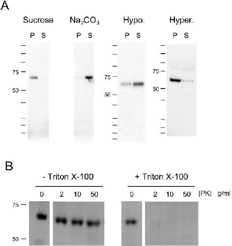 Figure 3. SpARC1 is a soluble luminal protein.A, Sub-cellular fractionation. Xenopus laevis embryos expressing myc-tagged SpARC1 were homogenized in a sucrose-containing buffer and diluted in to the same buffer (C), a carbonate-containing buffer (Na2CO3) or a hypertonic buffer (Hyper.). In other experiments the embryos were freeze-thawed and sonicated in a hypotonic buffer (Hypo.). All samples were centrifuged and the resulting pellets and supernatant fractions analysed by Western blotting. B, Proteolytic protection. Xenopus laevis embryos expressing myc-tagged SpARC1 were homogenized in a sucrose-containing buffer and the homogenates incubated with or without 1% v/v Triton X-100. Samples were then treated with the indicated concentration of proteinase K before Western blot analysis. |