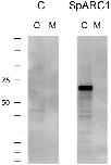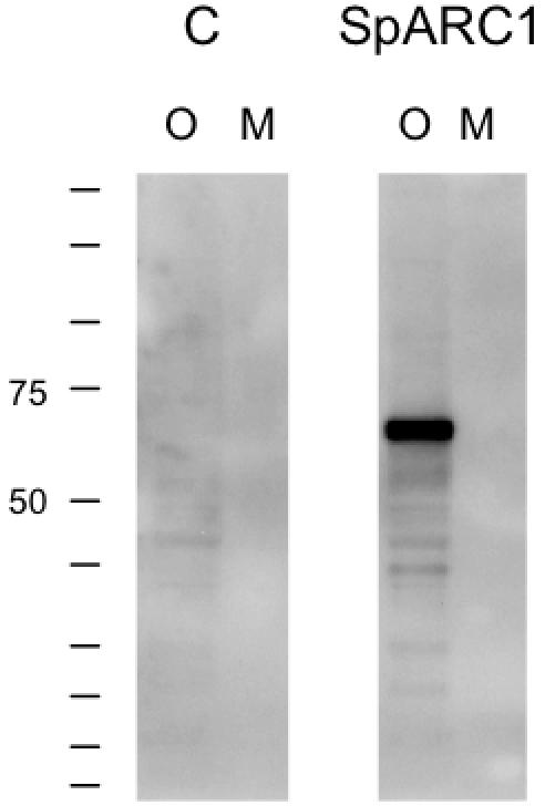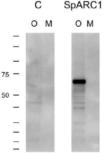 Figure 4. SpARC1 is not secreted.Control Xenopus laevis oocytes or oocytes injected with myc-tagged SpARC1 were cultured overnight and Western blots for both the oocytes (O) and culture media (M) performed. 0.5 oocyte equivalents were loaded in each lane. |