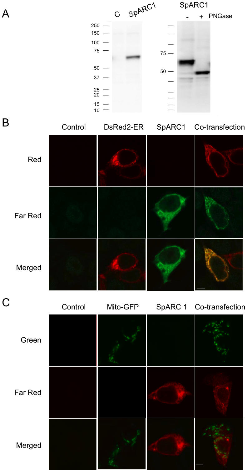 Figure 6. SpARC1 localizes to the endoplasmic reticulum in HEK cells.A, Western blot analysis using an anti-myc antibody of homogenates prepared from mock transfected cells (C) or cells transfected with myc-tagged SpARC1 (left). PNGase F treatment (right) was performed as described in Fig. 2. B–C, Expression of myc-tagged SpARC1 and DsRed2-ER (B) or mitochondrial GFP (C) in HEK cells transfected with the indicated plasmid or plasmid combination. SpARC1 expression was detected by immunocytochemistry using an anti-myc primary antibody and a Cy5-labelled secondary antibody, whereas the endoplasmic reticulum and mitochondria were visualized by fluorescence of the DsRed2 and GFP reporters, respectively. Results from control, mock-transfected cultures are also shown. Images were captured at the wavelengths corresponding to the colours marked at the side of the figure. |
