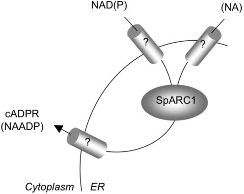Figure 9. Compartmentalized ADP-ribosyl cyclase signalling.Hypothetical scheme whereby putative transporter molecules allow delivery of substrates from the cytoplasm (Cyto.) to SpARC1 located in the endoplasmic reticulum (ER) and the subsequent release of the formed products. See text for details. |