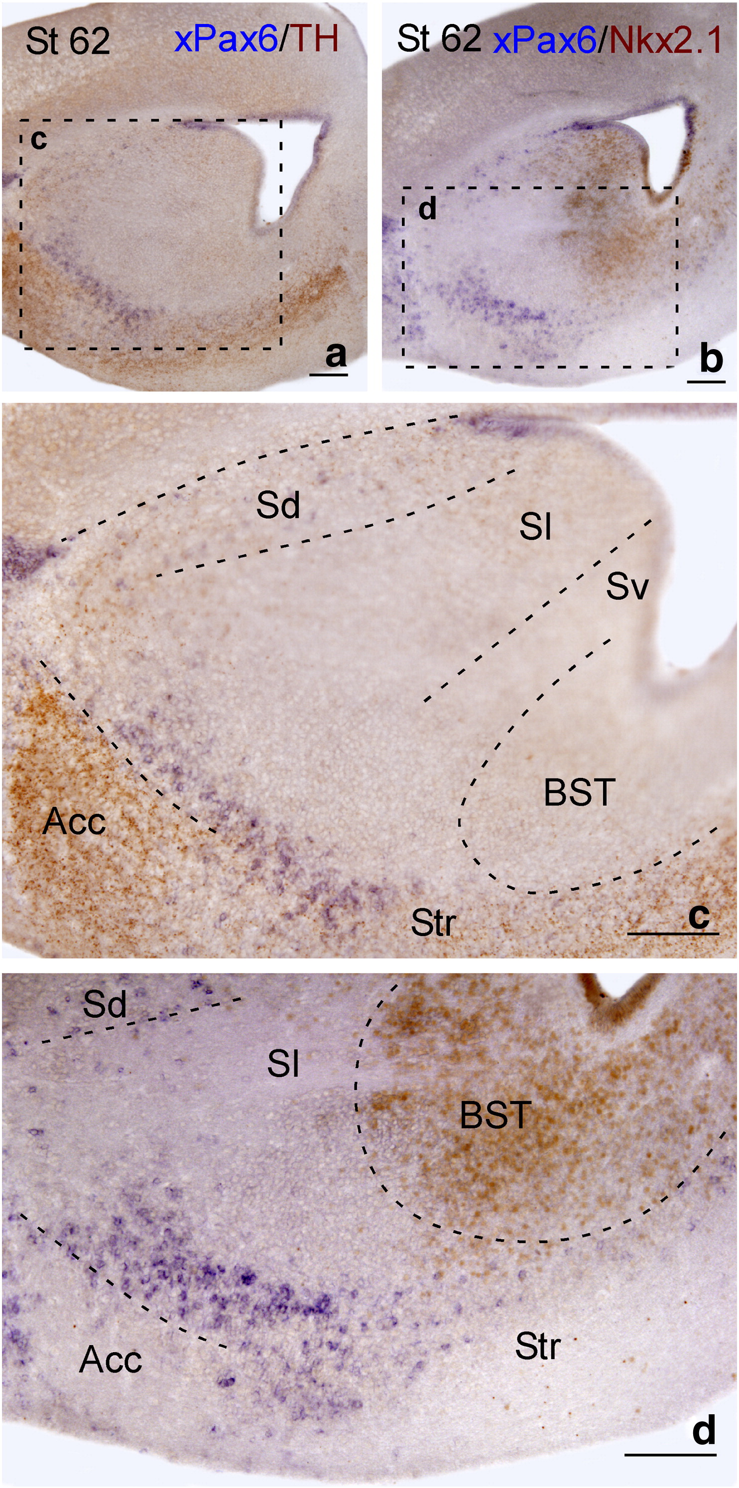 x-Pax6 expression in relation to TH and Nkx2.1. Photomicrographs of sagittal sections through the Xenopus telencephalon at prometamorphic stages, after in situ hybridization for x-Pax6 (blue) combined with TH (a,c) and Nkx2.1 (b,d) immunohistochemistry (brown). Dashed boxes in a and b indicate the amplified image of c and d respectively. Scale bar = 100 µm.