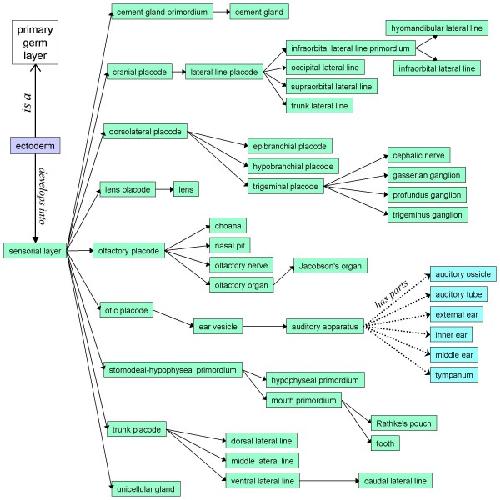 Figure 1. A portion of the Xenopus Anatomical Ontology's developmental map. Shown are the anatomical features to which the sensorial layer of the ectoderm gives rise. Types in green boxes have develops_from relationships to their parents. Also shown here are examples of the other two anatomical relationships that are integral to the XAO: ectoderm is_a primary germ layer; and the auditory ossicle, etc., are parts_of the auditory apparatus. The develops_from relationships are transitive: given that the lens develops from the lens placode and the lens placode develops from the sensorial layer, it is implied that the lens develops from the sensorial layer (and more generally from ectoderm). Transitivity operates over is_a relationships as well, e.g. the lens may be inferred to develop from a primary germ layer.