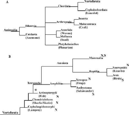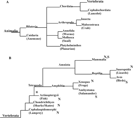 Figure 4. A ‘standard’ phylogenetic tree. This tree illustrates the relative position of the organisms examined here and is provided as a quick reference for taxonomic relationships, based on the Tree of Life Web Project. (A) The Kingdom Animalia/Metazoa was searched. Only those branches for organisms containing a Nudt16 ortholog are shown. (B) An expansion of the vertebrate branch reveals the conservation of Nudt16 and appearance of Syndesmos. The ‘N’ indicates branches with organisms containing Nudt16 orthologs, ‘S’ indicates branches containing Syndesmos and ‘asterisk’ indicates the likely gene duplication event; acknowledging the possibility that it may have occurred earlier with high rates of subsequent gene loss. Sequences ‘below’ the ‘asterisk’ have only the Nudt16 protein.