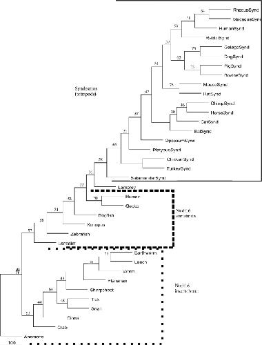 Figure 5. A tree of Nudt16 and Syndesmos identifies them as paralogs. Amino acid sequences were aligned, graphed and analyzed as in Methods section. The tree was visualized with TreeView. Bootstrap values are shown. Vertebrates and invertebrates are separated and phylogenetic relationships are comparable to the generic tree of evolution. Syndesmos sequences branch from the tetrapod lineage of the Nudt16 sequences.