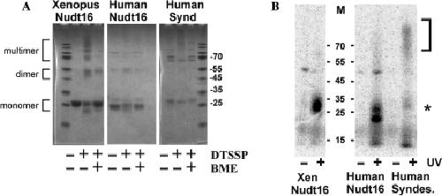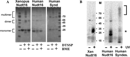 Figure 6. Functional comparison of paralogous proteins. (A) Chemical cross-linking to examine homodimer formation. Over-expressed, purified proteins were untreated or incubated with the reversible chemical cross-linker DTSSP (as indicated). One half of the treated samples were heated in the presence of reducing agent, BME to reverse the cross-link. All samples resolved on a NuPAGE gel. The 30 kDa Xenopus protein cross-linked to form a ∼60 kDa dimer and larger multimers, as indicated. These resolved to monomers under reducing conditions. Human Nudt16 formed a dimer which also resolved to a monomer under reducing conditions. Human Syndesmos did not appreciably alter mobility in the presence of the cross-linker, although some of the higher molecular weight contaminating proteins did alter mobility. Molecular weight markers are present on the far right and left with values indicated on the right. (B) RNA–protein cross-linking examined RNA binding. RNA and protein were incubated, then exposed (+) or not (−) to UV. After RNaseA digestion samples were resolved on NuPAGE gels and exposed to a phosphorplate. U8 snoRNA was cross-linked to Xenopus Nudt16 protein in a UV-dependent manner, resulting in labeled protein at 30 kDa. Human Nudt16 forms UV-dependent cross-links, migrating slightly faster, consistent with the smaller size of the human protein (see panel A). The human Syndesmos protein forms a faint UV-dependent cross-link migrating at 30 KDa, indicated by the asterisk and a higher order cross-link (indicated by the bracket) over 70 kDa. Molecular weight markers (M) are as indicated.
