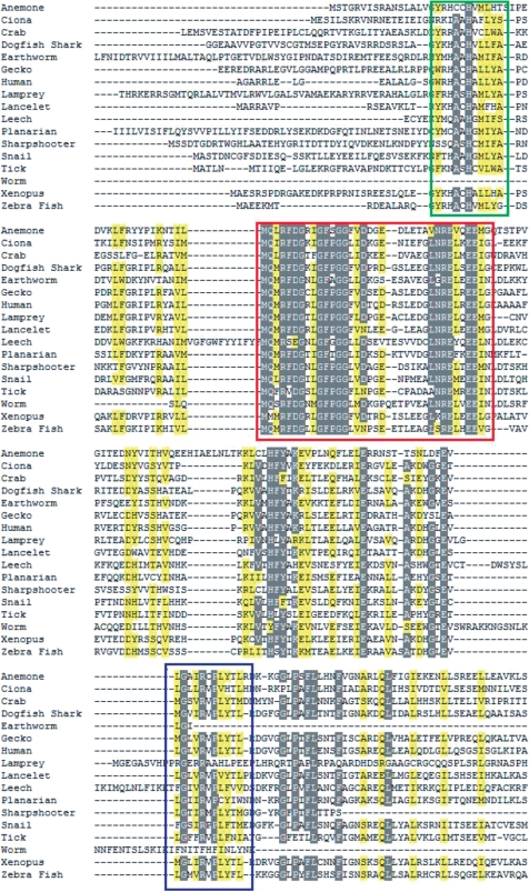 Figure 1. Amino acid alignment of putative Nudt16 orthologs from a sampling of the organisms found to have this protein. The alignment reveals three areas of highly conserved sequence, indicated by the green, red and blue boxes. A functional role based on structure for each conserved region is described in more detail in the text. To be designated as a Nudt16 homolog, sequences had to have the NUDIX domain (in red box) and the other two domains. Gray residues indicate identity; yellow highlighted residues show similarity. The accession number for each sequence used is listed in Supplementary Table 1.