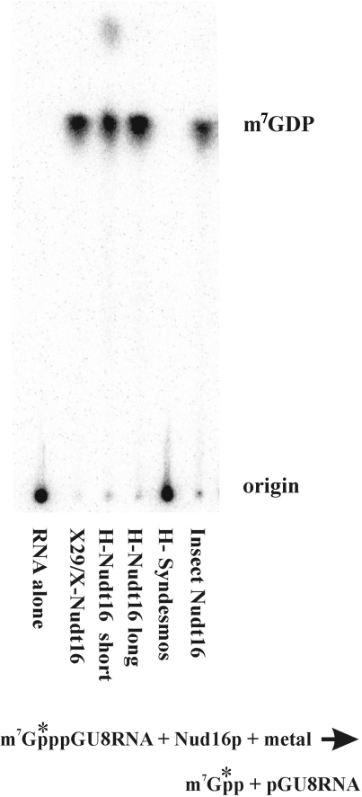 Figure 2. Insect Nudt16 protein is active for decapping RNA. Cap-labeled U8 RNA was incubated in the presence of buffer, Mn2+ and protein (as indicated) for 30 min at 37°C (reaction indicated below). Samples of the reactions were spotted on a TLC, which was developed and then visualized on a phosphorimager. The Xenopus (X29/X-Nudt16) protein, present as a positive control, released m7GDP from the cap-labeled RNA. The two human proteins, which varied by an unrelated amino terminal extension, were both efficient at decapping the U8 RNA. Insect (sharpshooter) Nudt16 protein hydrolyzed the RNA to release the m7GPD cap comigrating with that cleaved by the other orthologs. The human H-Syndesmos protein displays no decapping activity.