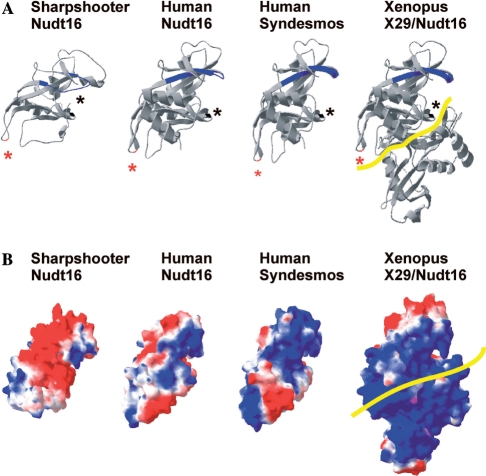 Figure 7. Structural comparison of paralogous proteins. (A) Molecular modeling of the orthologs and paralogs of Xenopus Nudt16p. The Xray crystal structure of Xenopus X29/Nudt16p (PDB: 2A8P) was used to model the human and sharpshooter Nudt16p proteins and human Syndesmos. Selected conserved residues were highlighted in the ribbon models to correctly align the models relative to each other. The blue strand (CVTHFY) is indicated with blue asterisks in Figure 4. The black asterisk is a conserved Phe residue near the catalytic site, while the red asterisk is a second conserved Phe residue indicated in Figure 4. The yellow line in the Xenopus protein is oriented across the dimer interface; the monomer above the line is oriented and positioned relative to the other three proteins. (B) Electrostatic charge potential of structures. Once the proteins were correctly oriented, electrostatic charge potential was calculated. Blue is positively charged surface and red is negatively charged. The yellow line in the Xenopus protein is oriented across the dimer interface as in (A).