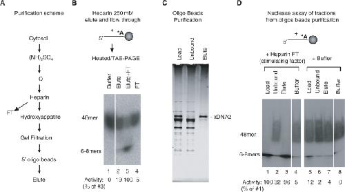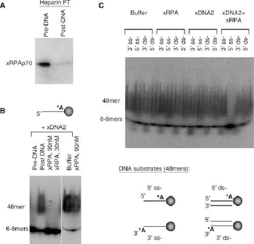 Figure 2. Identification of xRPA as the stimulating factor for xDNA2. (A) Western blot of xRPA (p70 subunit) in the heparin flow through before and after incubation with ss-oligo beads. (B) The stimulating activity in heparin flow through, before and after incubation with oligo beads, and pure xRPA (at 90 nM and 30 nM). The reactions were terminated with 1% SDS, heated at 95°C for 5 min, and then analyzed on an 8% TAE/PAGE. (C) Nuclease assay with different DNA substrates. The substrates were 48-mers in either ss- or ds-form. They were attached to magnetic beads, leaving either the 5′ or the 3′-end (of the 32P-labeled strand) accessible to the nuclease. The assay condition was similar to that in (B).