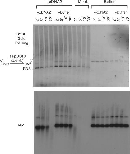 Figure 4. Effect of xDNA2 on 5′ ss-tail degradation. Denatured pUC19 DNA (2 ng/µl) labeled at the 3′-end was incubated in xDNA2-depleted or mock-depleted NPE supplemented with buffer or the purified xDNA2 (to ∼5% of the level of the endogenous xDNA2). Time points were treated with SDS/proteinase K and separated on a 1% TAE agarose gel. The gel was first stained with SYBR Gold to detect total DNA and then dried for exposure to X-ray film to detect 32P. The band migrated just below the ss-pUC19 DNA is the RNA in NPE.