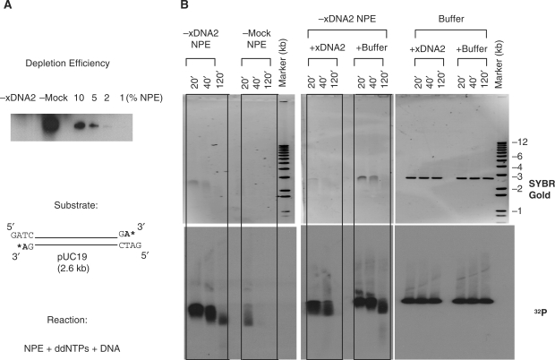 Figure 3. Effect of xDNA2 on DNA end processing. (A) Depletion efficiency, end processing substrate, and reaction set up. The quantitation standards for western analysis were NPE loaded at the indicated amounts relative the depleted NPE. The 3′-ends of the partially filled-in linear pUC19 were labeled with 32P-dA by Klenow. (B) Effect of xDNA2 depletion on end processing. DNA (2 ng/µl) was incubated in xDNA2-depleted NPE, mock-depleted NPE or xDNA2-depleted NPE supplemented with either ELB buffer or the purified xDNA2 protein (to ∼15% of the endogenous xDNA2 level) in the presence of ddNTPs (to block NHEJ). Two additional reactions containing xDNA2 or ELB buffer served as controls. Samples were taken at the indicated time, treated with SDS/proteinase K and separated on a 1% TAE/agarose gel. The gel was first stained with SYBR Gold to detect total DNA and then dried for exposure to X-ray film to detect 32P.