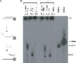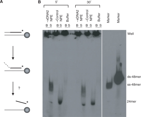 Figure 5. Effect of xDNA2 on end unwinding. (A) Principle of the unwinding assay. Thin line: normal nucleotides; thick line: thio nucleotides; *, 32P label. (B) The thio 5′ oligo duplex precoated onto Streptavidin magnetic beads was incubated in xDNA2-depleted or mock-depleted NPE. Samples were separated into bead and supernatant fractions, treated with SDS/proteinase K and analyzed on a 10% native TAE PAGE. B, beads; S, supernatant. The SDS/proteinase K treatment in this study was at room temperature for 2 h, a condition not harsh enough to disrupt the binding of biotin with Streptavidin (1).