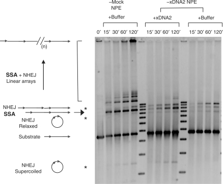 Figure 6. Effect of xDNA2 on SSA. The substrate, pRW4′, which carried two direct repeats at the partially filled-in XhoI protruding ends, was incubated in mock-depleted or xDNA2-depleted NPE (supplemented with xDNA2 or buffer) at room temperature. DNA samples were taken at the indicated times, treated with SDS/EDTA/Proteinase K, separated by TAE/agarose gel electrophoresis and detected by SYBR Gold stain. The SSA products include the band indicated by the arrow and a subset of the bands indicated by the bracket. The asterisks indicate the NHEJ products.