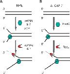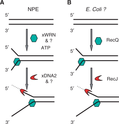 Figure 7. Model for the strand-specific processing of DNA ends. (A) End processing in the nucleoplasmic extract. xWRN (and potentially other helicases) are recruited to unwind the end in an ATP-dependent reaction. xDNA2 (and another exonuclease(s)) degrades the 5′ ss-tail. Proteins like MRE11 and CtIP (not depicted) might act upstream of xWRN. (B) The postulated RecQ-RecJ mechanism for end processing.
