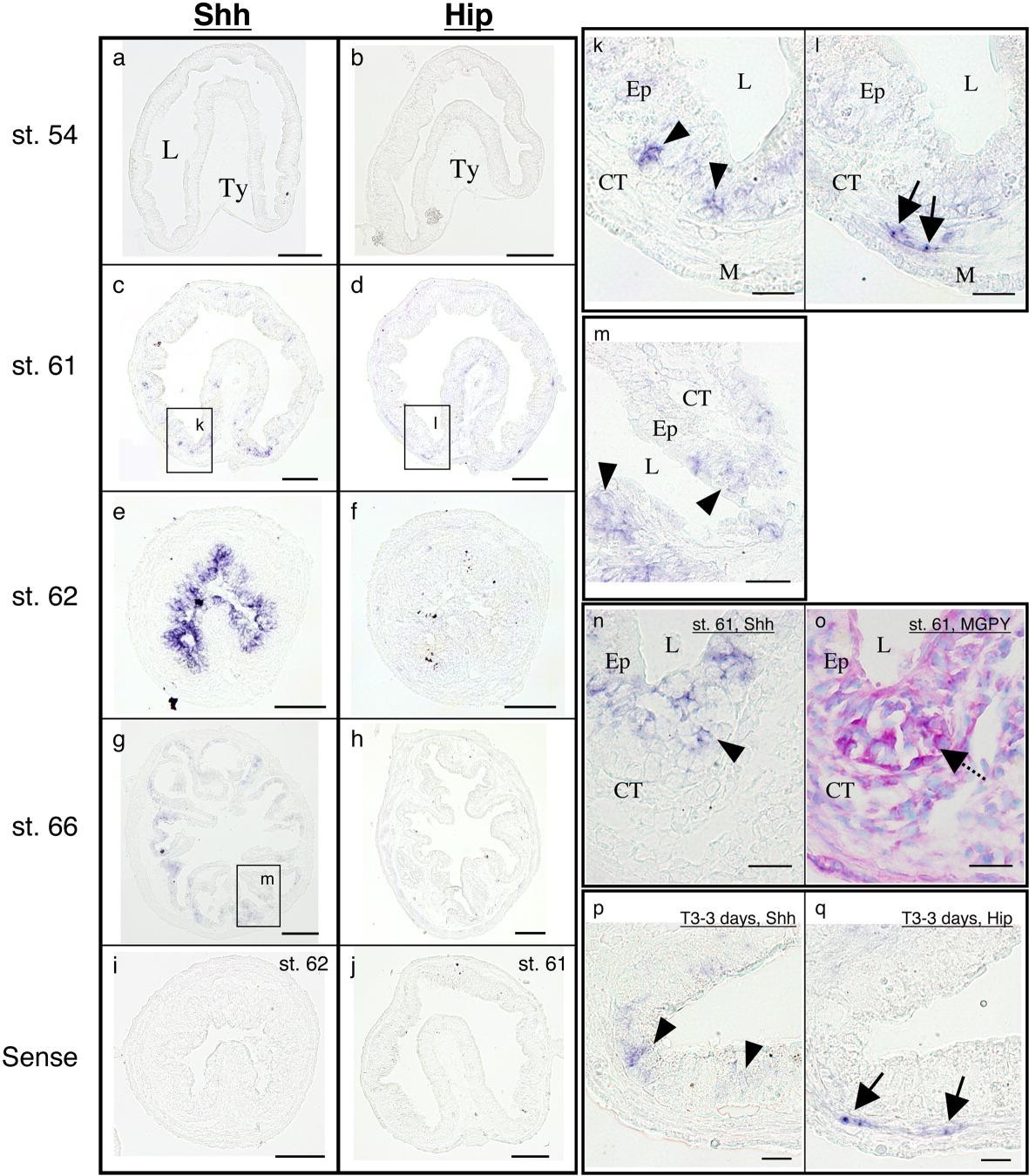 Figure 2. Spatiotemporal localization of Sonic hedgehog (Shh) and hedgehog interacting protein (Hip) mRNAs in the Xenopus laevis intestine during natural and thyroid hormone (TH) -induced metamorphosis. Cross-sections of the intestine at premetamorphic stage 54 (a,b), at metamorphic climax stages 61 (c,d,j-l,n,o) and 62 (e,f,i) and at the end of metamorphosis (stage 66; g,h,m), and the intestine isolated from stage 54 tadpoles treated with 10 nM T3 for 3 days (p,q) were hybridized with antisense Shh (a,c,e,g,k,m,n,p) and Hip (b,d,f,h,l,q) probes. Some of the sections were stained by methyl green-pyronin Y (MGPY) to identify the adult primordia (dashed arrow in the panel o). To compare the localization of Shh with that of Hip and with the adult primordia, serial sections were used (compare c with d, e with f, k with l, n with o, and p with q). Dark blue deposits indicate the sites of probe binding. Light or dark brown pigments in e, f, g, and h are melanin. Arrowheads indicate the cells expressing Shh, while solid arrows indicate those expressing Hip. k-m: Higher magnification images of a boxed area in panels c, d and g, respectively. Shh and Hip mRNAs are hardly detectable at stages 54 (a,b). Signals for Shh become stronger at stage 61 (c), reach the maximal level at stage 62 (e) and then decrease at stage 66 (g). Shh mRNA is expressed only in the epithelium (Ep) but not in other tissues throughout metamorphosis (k and m). Particularly, at the climax, the cells expressing Shh correlate well with the adult primordia stained strongly red with MGPY (n and o). At stage 66 (m), signals for Shh are detectable in the trough region of the mature intestinal fold (right side) and the entire epithelium of the developing intestinal fold (left side). On the other hand, signals for Hip are detected at stage 61 (d) only in the connective tissue (CT) close to the muscle layer (M) but beneath Ep (l), which expresses Shh (k). At stage 62, signals for Hip decrease (f), and then become hardly detectable at stage 66 (h). Overall patterns of Shh (p) and Hip expression (q) induced by exogenous TH are essentially identical to those during natural metamorphosis. Sense Shh (i) and Hip probes (j) do not give any signal. L, lumen; Ty, typhlosole. Scale bars = 100 mu m in a-j, 20 mu m in k-q.
