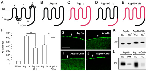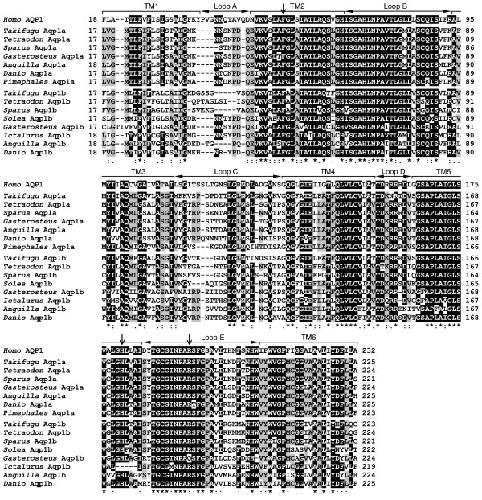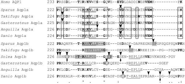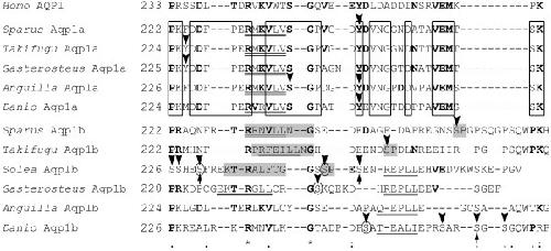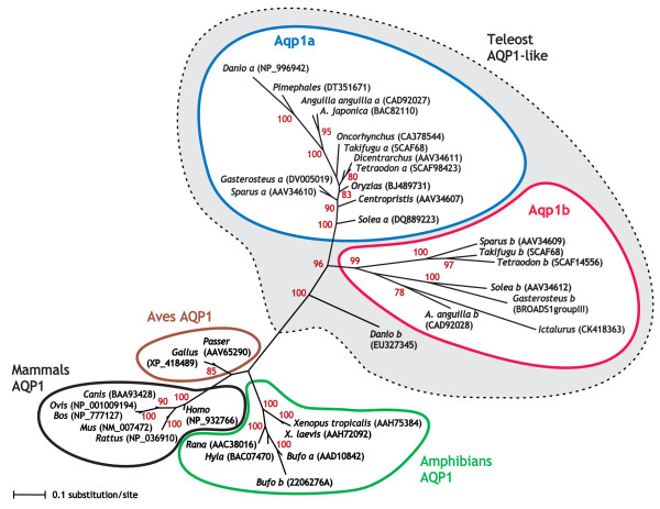 BACKGROUND: Teleost radiation in the oceans required specific physiological adaptations in eggs and early embryos to survive in the hyper-osmotic seawater. Investigating the evolution of aquaporins (AQPs) in these vertebrates should help to elucidate how mechanisms for water homeostasis evolved. The marine teleost gilthead sea bream (Sparus aurata) has a mammalian aquaporin-1 (AQP1)-related channel, termed AQP1o, with a specialized physiological role in mediating egg hydration. However, teleosts have an additional AQP isoform structurally more similar to AQP1, though its relationship with AQP1o is unclear. RESULTS: By using phylogenetic and genomic analyses we show here that teleosts, unlike tetrapods, have two closely linked AQP1 paralogous genes, termed aqp1a and aqp1b (formerly AQP1o). In marine teleosts that produce hydrated eggs, aqp1b is highly expressed in the ovary, whereas in freshwater species that produce non-hydrated eggs, aqp1b has a completely different expression pattern or is not found in the genome. Both Aqp1a and Aqp1b are functional water-selective channels when expressed in Xenopus laevis oocytes. However, expression of chimeric and mutated proteins in oocytes revealed that the sea bream Aqp1b C-terminus, unlike that of Aqp1a, contains specific residues involved in the control of Aqp1b intracellular trafficking through phosphorylation-independent and -dependent mechanisms. CONCLUSION: We propose that 1) Aqp1a and Aqp1b are encoded by distinct genes that probably originated specifically in the teleost lineage by duplication of a common ancestor soon after divergence from tetrapods, 2) Aqp1b possibly represents a neofunctionalized AQP adapted to oocytes of marine and catadromous teleosts, thereby contributing to a water reservoir in eggs and early embryos that increases their survival in the ocean, and 3) Aqp1b independently acquired regulatory domains in the cytoplasmatic C-terminal tail for the specific control of Aqp1b expression in the plasma membrane.