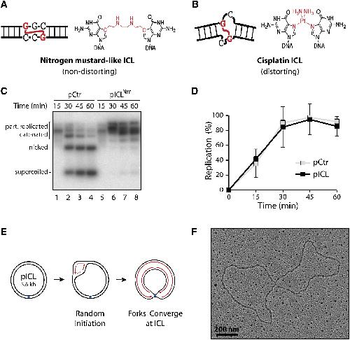 (F) pICLNm was replicated as in (C). Thirty minutes after NPE addition, DNA was analyzed by electron microscopy. The predominant species, a “Figure 8” structure, is shown.