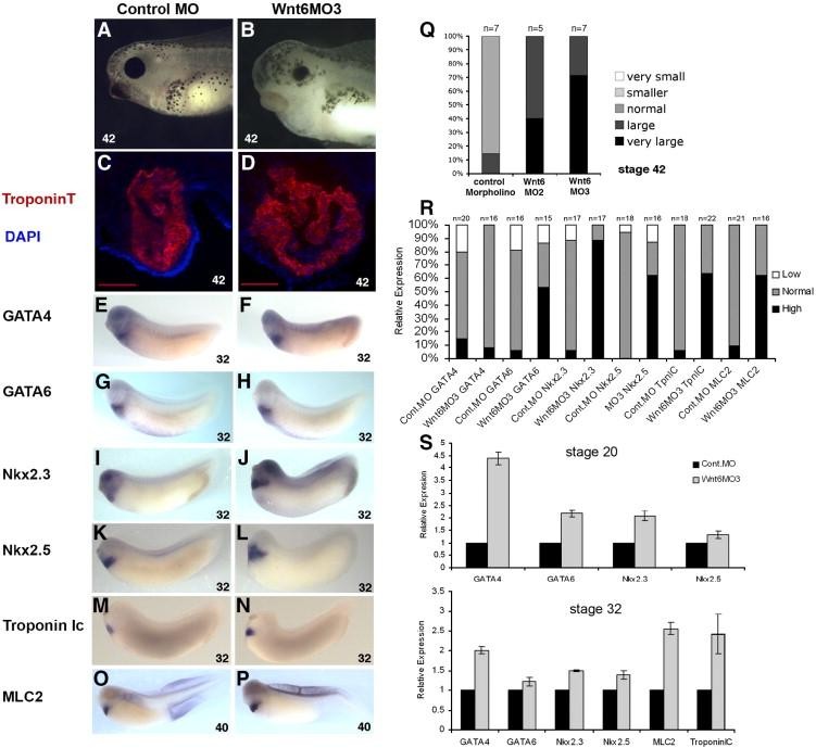 Fig. 2. xWnt6 is required for regulating heart muscle development. Morphology of the head and heart forming region at stage 42 (A, B), TroponinT immunohistochemisty analysis of sections through the heart forming region at stage 42 (C, D) and whole-mount RNA in situ hybridization analysis of marker gene expression at stage 32 (EâN) or at stage 40 (O, P) in embryos that were injected into the marginal zone of each blastomere at the two-cell stage with 20 ng of either the Control MO (A, C, E, G, I, K, M, O) or Wnt6MO3 (B, D, F, H, J, L, N, P). Note enlarged tissue mass in Wnt6 morphants in the heart forming region (panel B, compare to panel A) and more TroponinT-expressing myocardial tissue (panel D, compare to panel C, scale bar indicates 100 μm, see also panel Q). Also note slightly stronger and extended expression of GATA4 (panel F, compare to panel E) and GATA6 (panel H, compare to panel G), and much stronger and extended expression of Nkx2.3 (panel J, compare to panel I), Nkx2.5 (panel L, compare to panel K), TnIc (panel N, compare to panel M) and MLC2 (panel P, compare to panel O) (see also panel R). (Q) Percentage bar chart of TroponinT immunohistochemistry analysis of relative size of myocardial tissue in Wnt6 MO- and control MO-injected embryos at stage 42 (see also panels C, D). Note larger TroponinT-expressing tissue in Wnt6 MO-injected embryos. (R) Percentage bar chart of whole-mount RNA in situ hybridization analysis of heart marker expression in xWnt6 MO3- and Control MO-injected embryos at stage 32 (see also panels EâP). Note slightly increased expression of GATA4, and GATA6; and strongly increased expression of Nkx2.3, Nkx2.5, TroponinIc (TnIc) and myosin light chain 2 (MLC2) in xWnt6 MO3-injected embryos compared to controls. (S) Bar chart of qPCR analysis of cardiogenic transcription factor gene expression and heart muscle differentiation markers in xWnt6 MO3- and Control MO-injected embryos at stage 20 and stage 32. Note increased expression of GATA4 in particular at stage 20 and increased expression of heart muscle differentiation markers (MLC2, TnIc) in particular at stage 32 of development. |