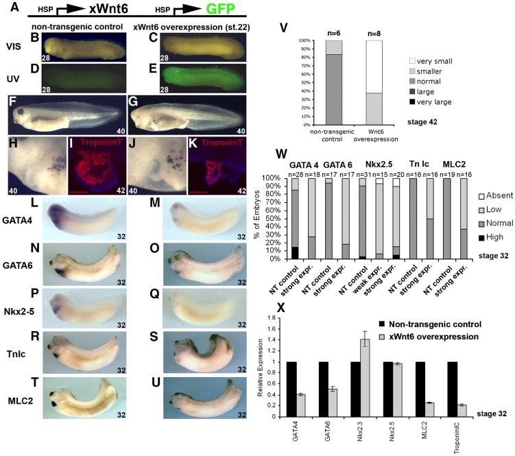 Fig. 3. Overexpression of Wnt6 during organogenesis stages inhibits heart muscle development. (A) Schematic representation of transgene for concomitant overexpression of xWnt6 and GFP in transgenic Xenopus embryos. (B-E) Identification of a non-transgenic control embryo (B, D) versus a transgenic embryo (C, E) induced at stage 22 by heat shock treatment to overexpress concomitantly GFP and xWnt6 viewed at stage 28 under UV light (D, E; compare with the same embryos viewed under visible light in panels B and C, respectively). Note only faint background fluorescence (mainly from yolk) in non-transgenic embryo (D), but strong fluorescence due to GFP expression in transgenic embryo (E). External morphology of whole embryos (F, G) and of the heart forming regions of the same embryos (H, J) at stage 40; TroponinT immunohistochemisty analysis of sections through the heart forming region at stage 42 (I, K); and analysis of marker gene expression with whole-mount RNA in situ hybridization at stage 32 (LâU) in non-transgenic control (F, H, I, L, N, P, R, T) and xWnt6-overexpressing transgenic embryos (G, J, K, M, O, Q, S, U). Note abnormal morphology in xWnt6-overexpressing embryos, particularly in the eye (G) and the heart-forming region (G, J). Note much reduced TroponinT-expressing myocardial tissue in xWnt6-overexpressing embryos (panel K, see also panel V). Note significantly reduced and restricted GATA4 (M) and GATA6 (O) expression, dramatic reduction of Nkx2.5 expression (panel Q, but see panel W and panel X) and restricted domains of TroponinIc (TnIc) (S) and Myosin Light Chain 2 (MLC2) (U) expression in xWnt6-overexpressing embryos. (V) Percentage bar chart of TroponinT immunohistochemistry analysis of relative size of myocardial tissue in non-transgenic control and xWnt6-overexpressing transgenic embryos; note much smaller TroponinT-expressing myocardial tissue in xWnt6-overexpressing embryos (see also panels I, K). (W) Percentage bar chart of whole-mount RNA in situ hybridization analysis of heart marker expression in non-transgenic control (NT) and weak or strong xWnt6 overexpression in transgenic embryos. Note reduction of GATA4, GATA6, TroponinIc (TnIc), myosin light chain 2 (MLC2) and generally Nkx2.5 expression in embryos with xWnt6 overexpression. (X) Bar chart of quantitative RT-PCR (qPCR) analysis of heart development marker gene expression in stage 32 embryos. Note reduced expression in xWnt6-overexpressing embryos, apart from Nkx2.3 and Nkx2.5. |