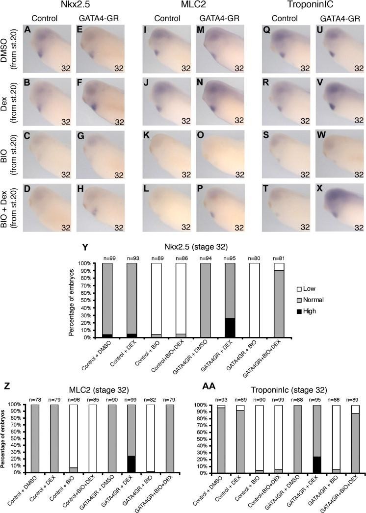 Fig. 6. Stage-specific activation of GATA4 during organogenesis stages rescues reduction of cardiomyogenic genes caused by activation of Wnt/β-catenin signaling. (AâX) Analysis of Nkx2.5 (AâH), MLC2 (IâP) and TroponinIc (QâX) expression with whole-mount RNA in situ hybridization at stage 32 in uninjected (AâD, IâL, QâT) and GATA4GR-injected (EâH, MâP, UâX) embryos treated from stage 20 with DMSO (A, E, I, M, Q, U); Dexamethasone alone (B, F, J, N, R, V); BIO alone (C, G, K, O, S, W); and BIO and Dexamethasone together (D, H, L, P, T, X). Note in embryos with activated GATA4GR increased Nkx2.5 (F), MLC2 (N) and TroponinIc expression (V); in embryos with BIO-mediated activated Wnt/β-catenin signaling clearly reduced Nkx2.5 (C, D, G), MLC2 (K, L, O) and TroponinIc expression (S, T, W); but note restored Nkx2.5 (H) MLC2 (P) and TroponinIc (X) expression in embryos where BIO-mediated activated Wnt/β-catenin signaling is combined with activated GATA4GR. (Y-AA) Bar charts showing the percentage of embryos with high, normal, or low Nkx2.5 (Y), MLC2 (Z) and TroponinIc (AA) expression in the experiments illustrated in panels AâX (n = number of embryos assayed for each treatment). |